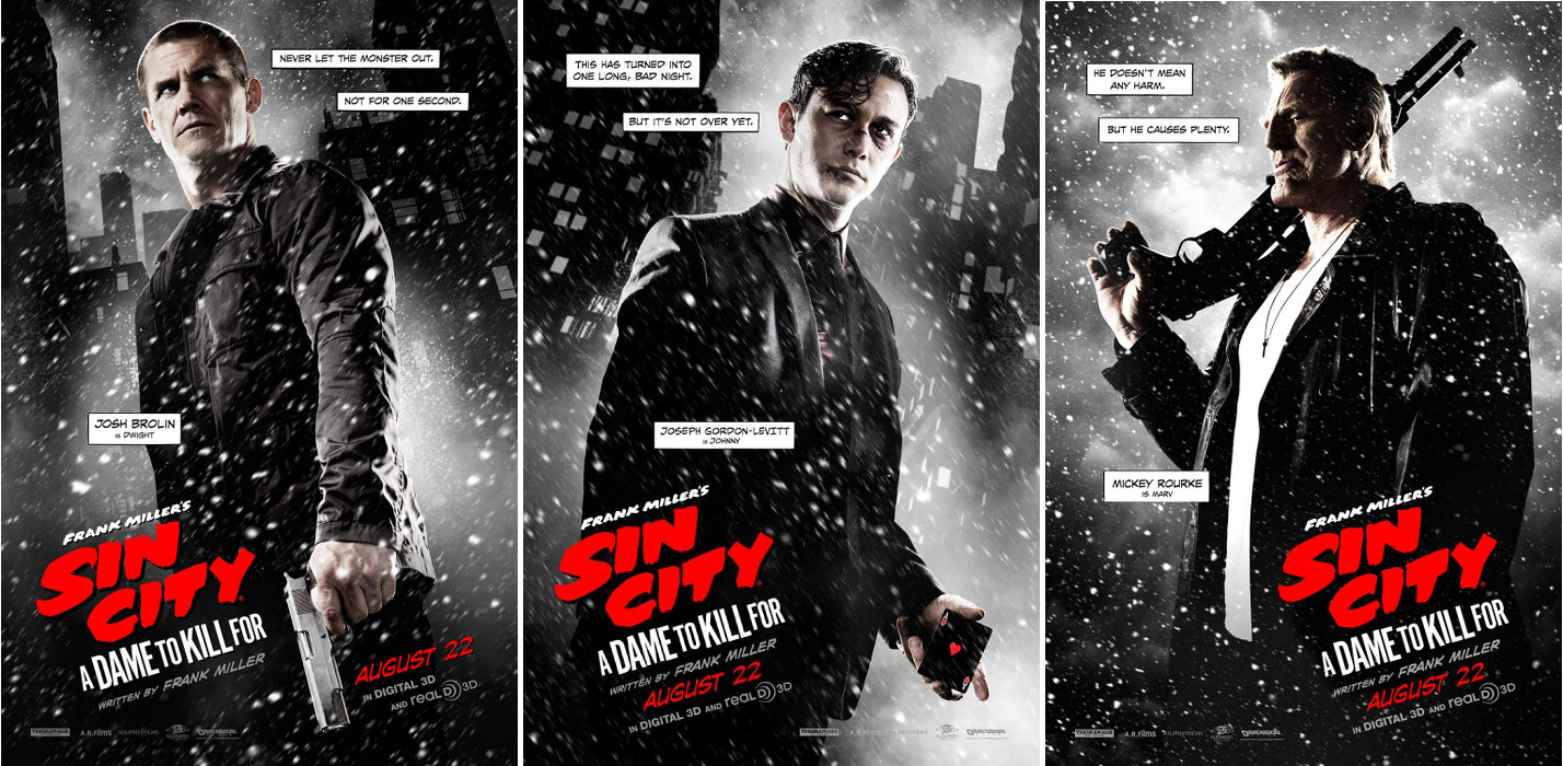 Sin City : J’ai tué pour Elle a comme segment principal la mini-série éponyme, la seconde dans le cycle de parution et l’une des plus fortes. Le film s’ouvre sur l’adaptation de la short story « Just Another Saturday Night » (paru dans Sin City #1/2) qui permet de retrouver le personnage le plus emblématique de la saga la brute indestructible Marv toujours interprété sous un épais maquillage (et une vingtaine de kilos de plus que dans le dernier volet) par Mickey Rourke. Les deux autres histoires sont des créations inédites spécialement écrites pour le film par Frank Miller, les premières depuis 14 ans. L’une met en vedette Joseph Gordon Levitt dans une variation d’un archétype bien connu du film noir : le joueur pris dans des parties de Poker à haut risque , la seconde suit la destinée de Nancy Callahan (Jessica Alba) la strip-teaseuse après le suicide de son protecteur Hartigan (Bruce Willis) à la fin de « That Yellow Bastard ».