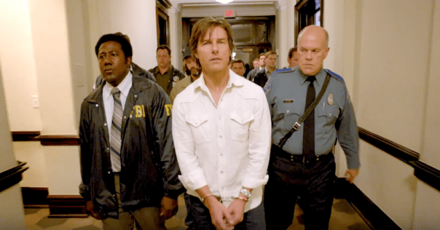Le film est conçu sur mesure pour Tom Cruise (un pilote casse-cou hyper-compétent au sourire permanent COME ON !!!), la star de cinquante cinq ans ans (un age purement indicatif à le voir ) après une série de contre-performances revient au top de sa forme et livre une prestation charismatique. Si dans une scene il écorne un des attributs les plus célèbres de son succès, Cruise ne s’aventure pas trop loin dans son coté obscur, comme il a pu le faire dans Magnolia. Aussi amoral soit-il – Barry Seal ne se soucie jamais des implications éthiques de ses actes, pas plus qu’il ne semble choqué du niveau de corruption et d’hypocrisie qu’il rencontre au plus haut de l’état américain – le personnage apparaît toujours éminemment sympathique : fidèle en amour , ne touchant jamais malgré des fêtes orgiaques à son « produit » la personnalité solaire de Cruise en éclipse les aspects les plus sombres. Toutefois malgré cette personnalité si définie la star sait offrir suffisamment de variations pour la rendre toujours intéressante. Il nous fait ressentir que pour malgré son audace, son charme et sa capacité d’adaptation, son Barry Seal n’est qu’un rouage parmi des milliers jouet de forces qui le dépassent prêtes à débarrasser de lui quand il aura perdu son utilité à leurs yeux. Si le film orbite autour de Cruise, Liman l’entoure d’une galaxie de second rôles solides (même si certains comme Jesse Plemons semble avoir été sacrifié au gré des remontages, son shérif semblant destiné à jouer un plus grand rôle) Sarah Wright impressionne dans le rôle Lucy l’épouse de Seal, Caleb Landry Jones (Get-Out) compose un de ses personnages peu reluisants dont il a le secret tout en lui donnant un coté tragique, Domhall Gleason est à la fois méphistophélique dans ses rapports avec Seal mais se révèle un bureaucrate médiocrement ordinaire incarnant la double nature des forces en jeu.