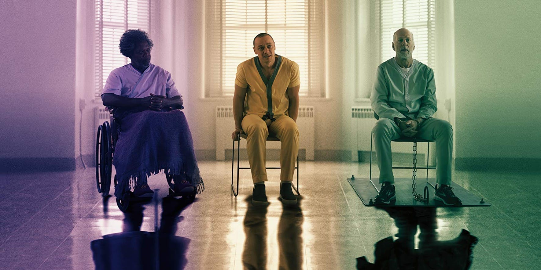 Au travers des thématiques super-héroïques M. Night Shyamalan veut essayer de mieux comprendre notre besoin de mythologie et d’histoires tout en développant une métaphore sur la capacité de chacun de libérer tout son potentiel, en dépit de ses fêlures , du regard que la société peut porter sur vous. Ce message a quelque chose de naïf mais efficace car il apparaît sincère. Si Shyamalan n’est pas un très bon dialoguiste et ses tirades explicatives sur la signification des comics sont assez pompeuses (et n’échappent pas à la redite de ceux d’Incassable) il est en revanche expert dans l’art de distiller ces concepts par l’image. C’est ainsi un régal pour l’amateur de comics de le voir donner sa version« réaliste » des grands tropes du genre super-héroïque . Il nous offre ici une transposition de l’Arkham Asylum et des prisons spéciales conçues pour retenir les super criminels malgré leur capacités extraordinaires mais aussi d’un autre concept, que nous ne révélerons pas ici, mais dont on trouve des itérations dans la plupart des univers de super-héros. Son approche épurée de la mise en scène, la rigueur formelle de ses compositions de plans et le travail sur les couleurs auquel il se livre avec son directeur de la photographie de Split Mike Gioulakis (It Follows, Under the Silver Lake) – une couleur est associé à chaque personnage (le vert pour David, le jaune pour Kevin et le violet pour Elijah) , les couleurs primaires des comics dominent quand ils sont persuadés de leurs pouvoirs et s’effacent quand ils en doutent – contribuent à l’atmosphère unique du film même si sa mise en scène atteint ses limites lors d’un combat final où son refus du spectaculaire prive la séquence d’un aspect vraiment iconique.Le score discordant de West Dylan Thordson (Split) qui réinterprète certains thèmes de James Newton Howard pour Incassable contribue grandement à l’atmosphère anxiogène du film.