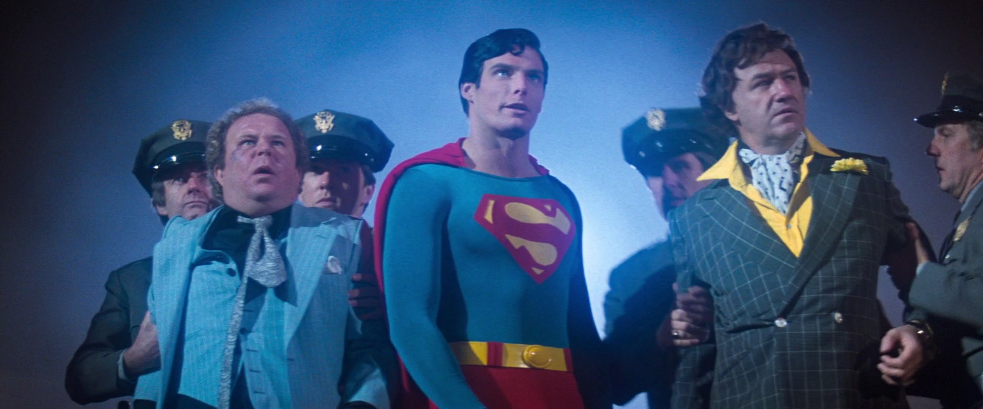 Dés la minute où il apparaît à l’écran dans le rôle (après plus d’une heure de film , un choix gagnant de Mankiewicz et Donner qui donne à son apparition un poids incroyable) , Reeve est parfait aussi bien en tant que Clark Kent / Superman. Il montre une compréhension instinctive de la différence entre les deux facettes du personnage, les épaules voûtées, la voix plus aiguë, redressant sans cesse sur son nez d’immenses lunettes en écailles en Clark Kent, il irradie l’autorité la bienveillance et l’honnêteté intrinsèque du personnage comme sorti d’une case de BD quand il revêt le costume conçu par Yvonne Blake (décédée cet été) un des meilleurs exemples de traduction d’un costume de comics à l’écran. Toute l’étendue de la performance de Reeve se retrouve dans une scène où on le voit se transformer sous nos yeux en Superman en modifiant légèrement sa posture son regard sans l’aide du moindre effet spécial. Sans doute son identification avec Superman l’empêchera d’avoir une carrière à la hauteur des promesses qu’il fit naître ici mais son interprétation de Superman est une des plus grandes performances de l’histoire du cinéma. Richard Donner et Tom Mankiewicz s’inspirent des comédies américaine de l’age d’or pour les interactions entre Reeve – qui bâti la personnalité de Clark Kent sur le modèle du personnage de Cary Grant dans L’impossible monsieur Bébé (1938) et la Lois Lane incarnée par Margot Kidder. Le personnage, même si elle reste une « demoiselle en détresse » profite de la vague féministe des années 70 et préfigure des personnages comme celui de Karen Allen dans Les Aventuriers de l’Arche Perdue. Ses séquences sont l’occasion de se moquer subtilement des tropes du mythe de Superman , quand Lois Lane interviewe Superman , ce dernier affirme : « Je ne mens jamais. ». Pourtant vivant à ses cotés sous son identité secrète de Clark Kent, il vient de faire « le plus grand mensonge de tous les temps ». Une des faiblesses du film est sans doute l’absence d’un méchant fort. Cela ne retire rien à la performance de Gene Hackman, mais l’écriture essentiellement comique du personnage de Lex Luthor affublé d’un acolyte burlesque Otis (Ned « fais la truie » Beatty) en fait un personnage charmant et amusant mais rarement menaçant une distraction qu’un véritable adversaire. A l’exception de la première rencontre entre Luthor et Superman où Hackman parvient à dévoiler une facette inquiétante , brutale et psychopathique de son personnage.
