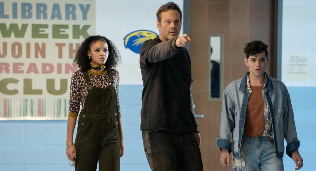 Beaucoup de la réussite du film tient au casting de Vince Vaughn, longtemps abonné à des rôles comiques (Wedding Crashers et Dodgeball) il a pris depuis la deuxième saison de True Detective un virage dramatique renforcé par sa participation à deux films de S.Craig Zahler Section 99 et Trainé sur le bitume. Fort de ces expériences il parvient ici à être convaincant à la fois en psychopathe traquant silencieusement ses victimes, arme à la main, apparaissant soudainement dans un parking vide, un brouillard vaporeux autour de son immense silhouette ET en adolescente avec des problèmes de confiance en soi. Sa stature imposante, c’est vraiment un colosse, et son écart de taille (il mesure 1M96) avec l’ensemble de ses partenaires adolescents sert son personnage dans les deux aspects du film il apparait ainsi authentiquement menaçant quand il incarne le tueur et maladroit avec son cops disproportionné quand Millie y est coincée. Le succès de sa performance est qu’il ne se repose pas sur l’aspect purement burlesque de la situation, il a même deux scènes émotionnelles avec des personnages de l’entourage de Millie. Ainsi une conversation dans une cabine d’essayage avec sa mère , qui n’a aucune idée qu’elle parle à sa fille et donne à Millie une chance d’être honnête sans aucune crainte. Une autre où elle déclare sa flamme toujours dans le corps de Vaughn au sportif dont elle est amoureux en secret. Kathryn Newton établit Millie comme une jeune fille hésitante, moquée par ses camardes plus fortunées, luttant pour se remettre de la mort de son père avant de composer une attitude tout aussi crédible quand l’esprit homicide du Boucher s’empare d’elle. Ce n’est pas seulement sa nouvelle tenue : un rouge à lèvres rouge vif (ou plutôt rouge sang) et une veste de moto badass qui nous font accepter sa transformation. Newton perfectionne un regard impitoyable, plein de ressentiment et un gloussement maniaque quand elle échappe à la police qui font perdurer la menace du tueur même dans un corps d’un mètre soixante-cinq. Elle compose enfin quand elle retrouve son corps une Millie transfigurée par l’expérience qui peut aux cotés de sa mère et sa grande sœur (Dana Drori ) affronter le tueur dans une variation intelligente du cliché de la « final girl ».