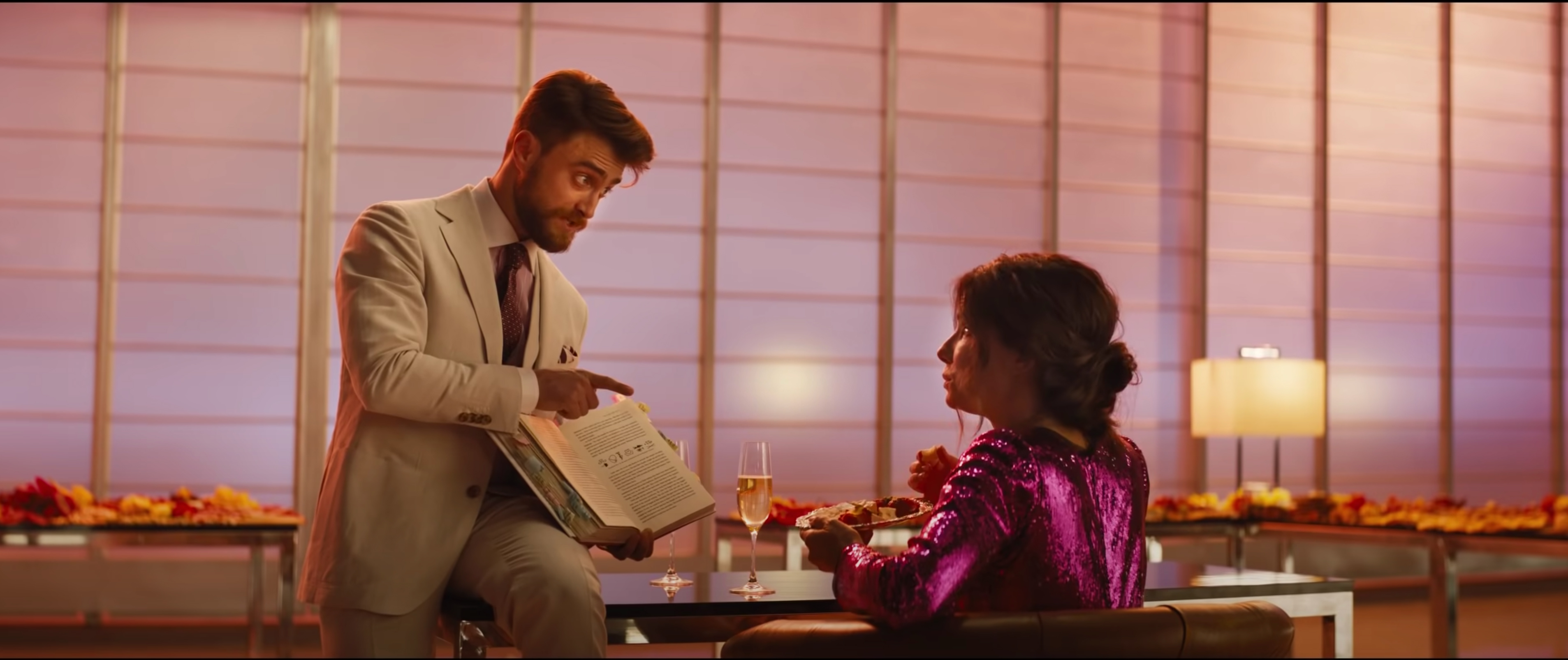 Des personnages secondaires pittoresques parsèment le film ajoutant des moments d’humour décalé à un scénario plutôt prévisible, Beth l’agent de Loretta incarné par Da’Vine Joy Randolph (Mon nom est Dolemite) une femme qui essaie juste de bien s’occuper de sa cliente tentant à la fois de la sauver et de sauver la tournée de promotion du livre. Allison (Patti Harrison) community manager assignée à Loretta ou Oscar Nunez pilote d’avion cargo dont le meilleur ami est une chèvre. Le plus notable étant bien sur le cameo de Brad Pitt en soldat de fortune, volant presque le film à ses stars. On a dit de Pitt qu’il etait un « character actor » dans le corps d’un dieu grec et il est vrai qu’il n’est jamais aussi à l’aise que dans la comédie, sa filmographie comptant finalement plus de ses compositions loufoques que de héros d’action. Il parodie ici aussi bien un archétype récurrent du film d’action l’ »extracteur » comme le personnage incarné par Chris Hemsworth (autre acteur comme Pitt et Tatum n’hésitant pas à se moquer de lui-même) dans le récent Tyler Rake que sa propre image . »Pourquoi êtes vous si beau ? » lui demande le personnage de Bullock « Mon père présentait la météo » lui répond Pitt. Daniel Radcliffe est l’unique élément du film qui ne fonctionne pas aussi bien que le reste, son personnage est le seul où le film tente de changer les archétypes établis et on ne le sent pas à sa place dans une histoire où tout le monde s’intègre parfaitement dans son rôle ,sans doute à cause des limites de son jeu.