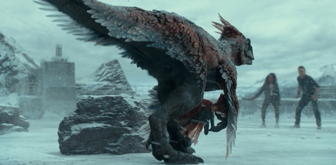 C’est d’autant plus dommage que les effets spéciaux qui donnent vie aux dinosaures n’ont jamais été aussi réussis avec un mélange parfait et fluide d’effets numériques et d’animatronique. Il y a une tentative notable de ramener leur conception de dinosaures à des espèces authentiques (pas de nouvelles créatures hybride) tout en incorporant les dernières théories sur leur apparence et leur comportement (un dinosaure à plumes !!!). Mais leur multiplication, il y en a jamais eu autant dans un film de la franchise fait perdre à leurs apparitions le sens de crainte et d’émerveillement qui ravissait autrefois le public. ll y a bien sur (et heureusement) de nombreuses séquences très réussies impliquant des dinosaures dans Jurassic World Le Monde D’Après mais les scénaristes ne parviennent jamais à les intégrer de manière organique dans une trame cohérente . Le film est si long et manque cruellement de rythme jusqu’à s’enliser dans son interminable dernière partie. Le seul moment qui retrouve le souffle de l’aventure est sans aucun doute une séquence bourrée d’action à Malte, qui passe d’un bazar de dinosaures clandestins à une poursuites à grande vitesse, cinétique et haletante dans les rues de la vieille ville entre Owen et des dinosaures décidés à le dévorer. On se surprend à y retrouver quelques plans comme celui où la caméra semble suivre le saut d’un dinosaure à travers une fenêtre aux trousses d’Owen qui évoquent la franchise Jason Bourne. En consultant le générique on constate que c’est à Dan Bradley, la star des coordinateurs d’action (qui enfanta du style saccadé et frénétique des Bourne) que revient la tache d’orchestrer le chaos de l’action. Si son travail est moins méticuleux que sur les films de Paul Greengrass , on ressent néanmoins clairement sa patte dans l’impact des scènes d’action.