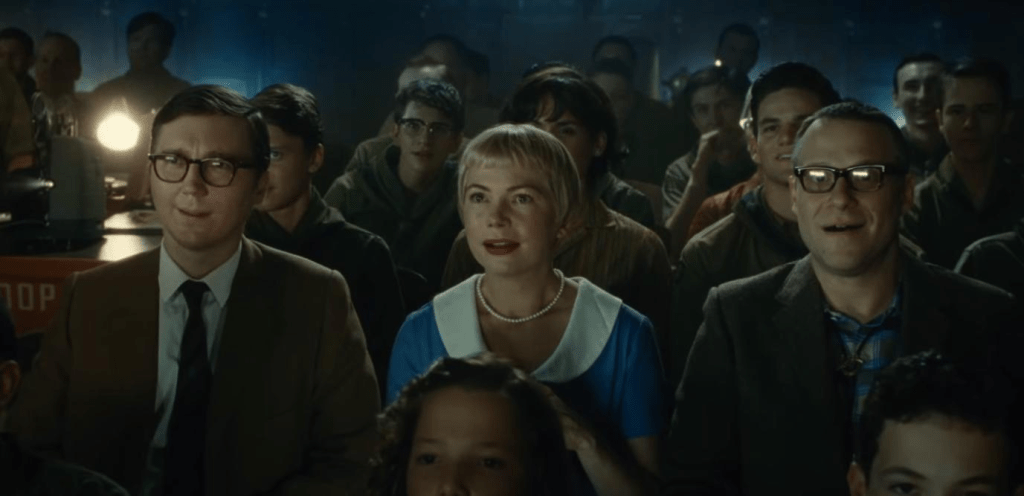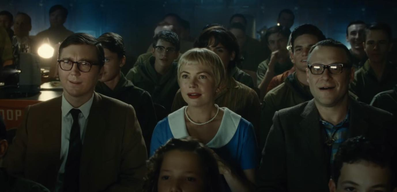 L’acteur canadien LaBelle fait un bon travail en incarnant les attributs de son propre réalisateur, mais le jeune interprète a si peu de nuances à jouer qu’il peut pas faire grand-chose si ce n’est d’espérer des pouces levés de son homologue du monde réel derrière sa caméra. Spielberg tente d’accorder plus d’attention dans le scénario (le premier qu’il co-signe depuis AI) pour le portrait de Burt et Mitzi, mais ne parvient pas à ne faire autre chose que des archétypes : Burt est intelligent et prudent, Mitzi frustrée et impétueuse. Paul Dano joue l’intériorité et lutte pour donner de la profondeur à un homme plat mais semble jouer sous Tranxène. Mais il s’en sort relativement bien par rapport à la pauvre Michelle Williams. Le personnage de Mitzi est la pierre angulaire du film et si la performance de Williams semble extrêmement sincère elle nécessite un minimum de discipline de la part de son réalisateur, ce que Spielberg apparemment, ne peut lui offrir. Il y a vraiment un sujet dans la manière dont Spielberg dirige ses actrices, déjà l’excellente Carrie Coon ridicule dans son petit rôle de Pentagon Papers agissait comme un signal d’alarme. Michele Williams est ici en surjeu permanent jusqu’à devenir embarrassante avant que son personnage disparaisse en quelque sorte du centre du film. Nos cheveux se dressent sur la tète à entendre parler d’un éventuel Oscar couronnant une des pires interprétations de son interprète. Je sauve néanmoins de façon l’interprétation de Seth Rogen étonnamment le plus fin , le seul qui fasse passer une émotion authentique. Judd Hirsch (en grand-oncle fantasque de Sammy) et David Lynch (en John Ford, que Sammy rencontre à la fin du film) sont excellents et apportent un peu de vie à ce livres d’images compassé, mais leur performances semblent appartenir à leurs propres films finalement tangents au récit principal.