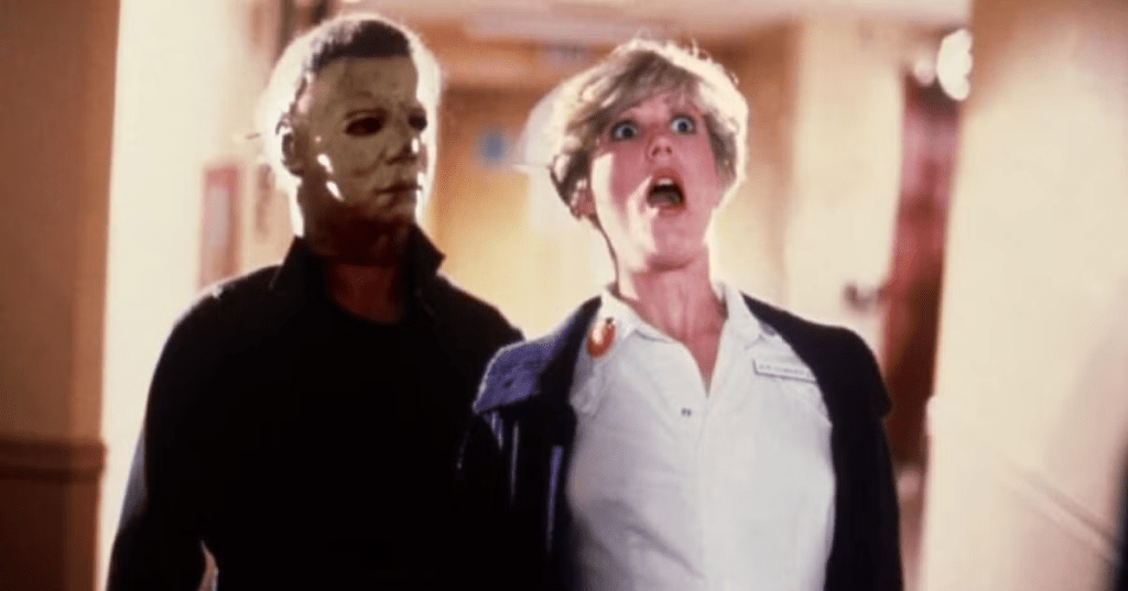 Le choix du décor principal est sans doute la plus grande réussite artistique du film. Après les banlieues résidentielles ensoleillées du premier, nous sommes jetés dans l’environnement clinique froid et quasi désert de l’Hôpital Mémorial Haddonfield. La conception artistique des décors exploite le minimalisme médical. L’ambiance hospitalière claustrophobe est exploitée à son paroxysme : des couloirs interminables plongés dans une semi-obscurité bleutée, des blocs opératoires vides, des salles de bain inondées par la lumière blafarde des néons. La photographie de Dean Cundey (Jurassic Park, Apollo 13) est, comme dans l’original, le véritable marqueur visuel de la franchise. Il utilise la lumière de manière magistrale, opposant les noirs profonds à des sources lumineuses crues (lampes de poche, néons, lumières rouges d’urgence) pour créer une atmosphère oppressante et effrayante. Le ton est plus sombre et méchant, instillant une sensation d’insécurité constante. Dans ce décor d’une vulnérabilité maximale, Michael Myers improvise, les kills sont variés et exploitent l’arsenal médical : le scalpel, la seringue, ou encore l’absurde et exploitative scène du jacuzzi brûlant (la mort de l’infirmière nue, typique des excès gores et absurdes des années 80), qui, est devenue un moment iconique de la terreur clinique. Bien sûr, le film prend des libertés narratives notables dans ce contexte, notamment le cliché de la sécurité laxiste (l’hôpital n’est géré que par une poignée de personnel incompétent, comme le garde Mr. Garrett qui patrouille mollement) et le personnel hospitalier ultra réduit (seulement quelques infirmières et un Dr. Mixter manifestement ivre) mais ces faiblesses servent en fin de compte l’objectif de la suite : isoler Laurie Strode (Jamie Lee Curtis) pour mieux intensifier sa traque.