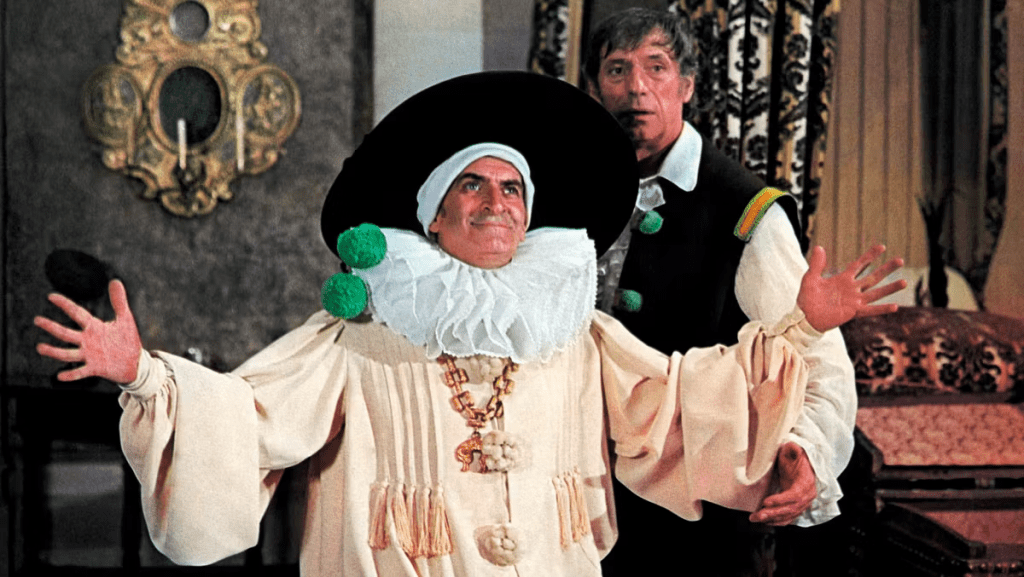 L’interprétation repose sur un équilibre miraculeux. Bien servi par l’écriture ciselée de Danièle Thompson et Marcel Jullian, Louis de Funès, dans le rôle de Don Salluste, atteint une forme de perfection dans la tyrannie comique. Le titan du comique français maîtrise ici totalement son personnage. Il incarne avec une précision chirurgicale ce type veule et explosif, pathétiquement faible avec les forts et cruellement fort avec les faibles, devenant quasiment un personnage de cartoon live au milieu de décors réels. Sa gestuelle, sa mauvaise foi et ses ruptures de ton sont celles d’un virtuose au sommet de son art. Il est réjouissant parce qu’il est monstrueux. Le spectateur rit avec lui et contre lui simultanément, ce qui est la marque des grands personnages comiques depuis Molière. Sa défaite coïncide avec l’apothéose de l’acteur, dont le jeu, en roue libre, s’ouvre à sa part la plus inventive. C’est précisément là que le cartoon live prend tout son sens : il y a dans ce de Funès-là quelque chose qui dépasse le jeu humain ordinaire pour atteindre l’abstraction pure du personnage animé — une créature de la démesure, régie par ses propres lois physiques et morales. Face à lui, Yves Montand impose une élégance décontractée et une ironie fine qui servent de contrepoint idéal à la frénésie de son partenaire. Les seconds rôles ne sont pas en reste, avec une Alice Sapritch inoubliable en Dona Juana, dont la scène de strip-tease parodique reste l’un des sommets de l’absurde. Elle apporte au film une folie douce et une autodérision qui en font le contrepoint parfait à l’hystérie contrôlée de de Funès. Karin Schubert en Reine lointaine et désirable, Alberto de Mendoza en Roi falot et complaisant, Paul Preboist en complice servile — tous trouvent leur juste place dans cette mécanique de précision. Là conception artistique du film est un pilier central de sa réussite. Gérard Oury a bénéficié de moyens colossaux, permettant une esthétique baroque où les couleurs jouent un rôle narratif majeur. Le contraste entre l’opulence des rouges et des ors de la cour et l’austérité noire de l’Inquisition souligne visuellement cette « folie des grandeurs ». Les décors naturels de l’Escurial et de la région d’Almería offrent une authenticité monumentale, tandis que les costumes de Jacques Fonteray, d’une précision historique admirable, deviennent des outils de jeu pour les acteurs, comme la fraise immense qui semble emprisonner le cou de Don Salluste. Le montage du film, nerveux et précis, assure une transition fluide entre les scènes de pur burlesque et les moments d’aventure.