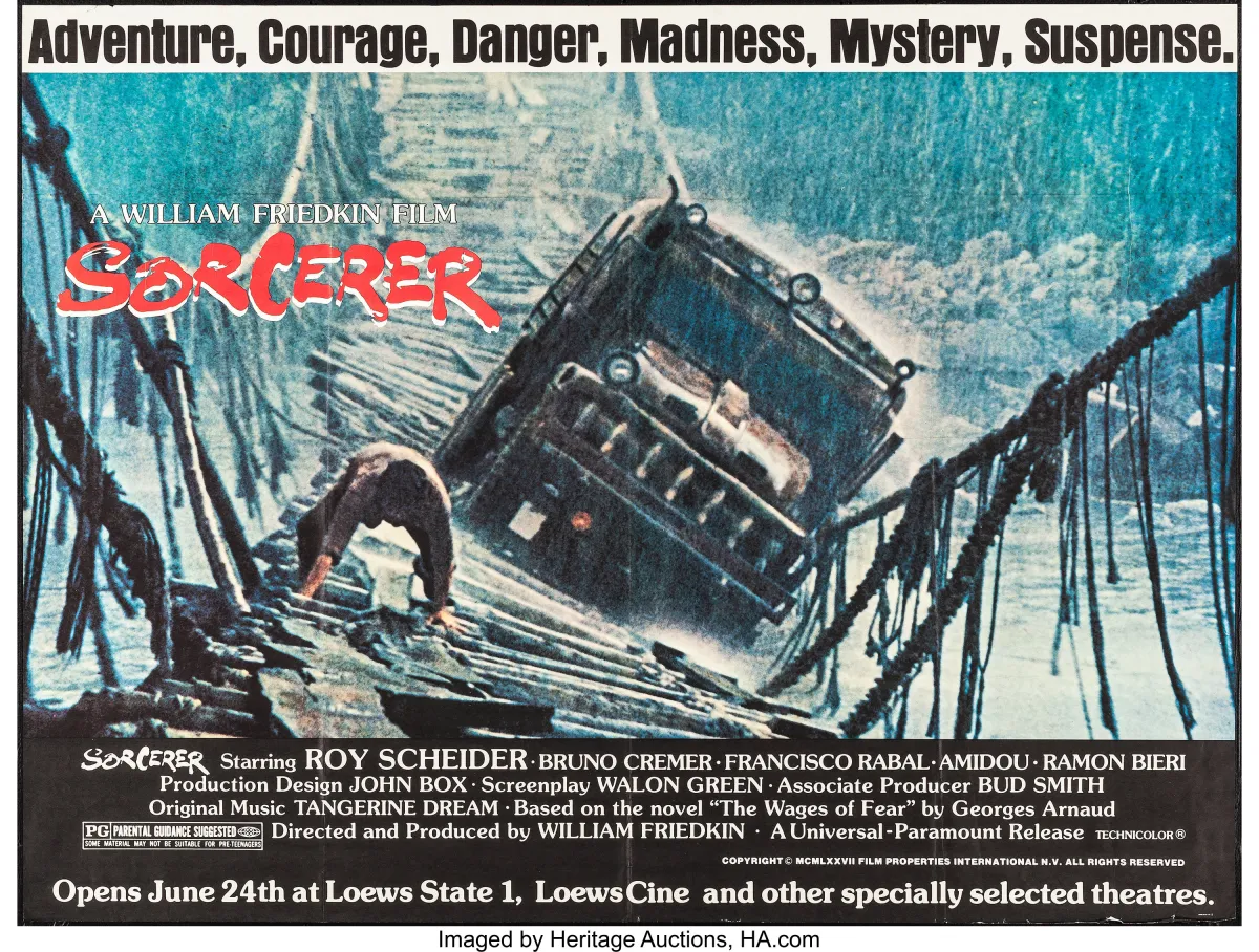 ll existe des films dont la simple évocation convoque immédiatement des images de sueur, de boue et de métal hurlant. Sorcerer, réalisé par William Friedkin en 1977, appartient à cette catégorie rare des œuvres qui ne se contentent pas de raconter une histoire, mais qui semblent avoir été arrachées à la réalité par la force brute. Quand William Friedkin se lance dans ce projet il est au sommet de sa puissance à Hollywood. Auréolé de l’Oscar de la mise en scène pour The French Connection et d’une nomination pour L’Exorciste qui a remporté un triomphe inattendu il peut imposer ses projets, ses budgets et ses méthodes.Il choisit alors d’adapter le roman Le Salaire de la peur de Georges Arnaud, déjà porté à l’écran en 1953 par Henri-Georges Clouzot. Friedkin réfute pourtant l’idée de remake : il affirme revenir directement au roman pour en proposer une lecture personnelle, plus fidèle à l’esprit du livre. À l’origine, le film devait être relativement modeste , avec un budget estimé à 2,5 millions de dollars qui va enfler jusqu’à atteindre 22 millions en se déplaçant en grande partie en République dominicaine, au cœur d’un tournage chaotique. Un ouragan détruit des décors, les tensions avec le directeur de la photographie Dick Bush provoquent son départ en plein tournage. Friedkin le remplace par John M. Stephens, dont le travail , notamment l’usage de réflecteurs pour dompter les ombres de la jungle , donne finalement à l’image une puissance remarquable. Le processus de casting est tout aussi mouvementé : Steve McQueen voulait le rôle mais exigeait la présence de sa compagne Ali MacGraw, demande refusée par Friedkin, qui dira plus tard le regretter ; Robert Mitchum décline, Jack Nicholson et Clint Eastwood refusent de voyager, tandis que Marcello Mastroianni renonce lui pour des raisons familiales. Dans les seconds rôles, Lino Ventura refuse d’apparaître derrière Roy Scheider au générique, le rôle revient donc à Bruno Cremer, un choix qui s’avérera excellent. Le scénario de Walon Green, déjà auteur de The Wild Bunch pour Sam Peckinpah, reste volontairement sec et dépouillé : à partir de l’ossature du film de Clouzot, Friedkin et Green construisent un thriller de survie d’un réalisme presque documentaire, où quatre hommes rejetés par la société transportent de la nitroglycérine à travers une jungle écrasante. Le film devient ainsi à la fois un récit de tension extrême et une sombre parabole sur la fatalité, le hasard et la fragilité humaine nourrie d’influences européennes, du film noir américain et de l’ombre de Joseph Conrad et son Au cœur des ténèbres. Friedkin y ajoute aussi une dimension politique : la misère de la ville fictive dominée par une dictature et par une compagnie pétrolière américaine toute-puissante, renvoie directement à la réalité de l’exploitation des populations d’Amérique latine.